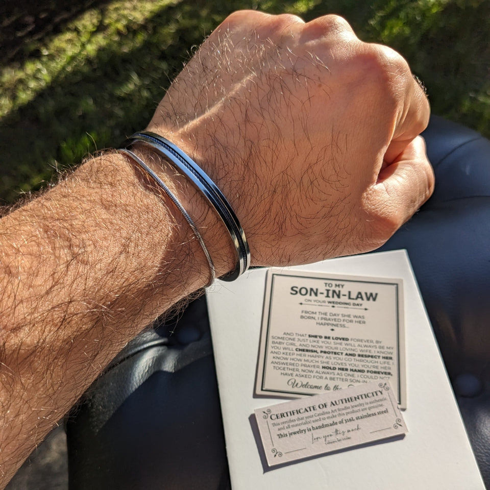 🎁 Unique Gift for Son: A one-of-a-kind masculine bracelet perfect for your son.🏢🏞️ Versatile Style: Ideal for both work and play, adding a masculine touch.🛠️💎 Durable Material: Crafted from stainless steel, sturdy for daily wear.🔗🕶️ Timeless Design: Classic interlocking link chain, great for stacking with other pieces.
